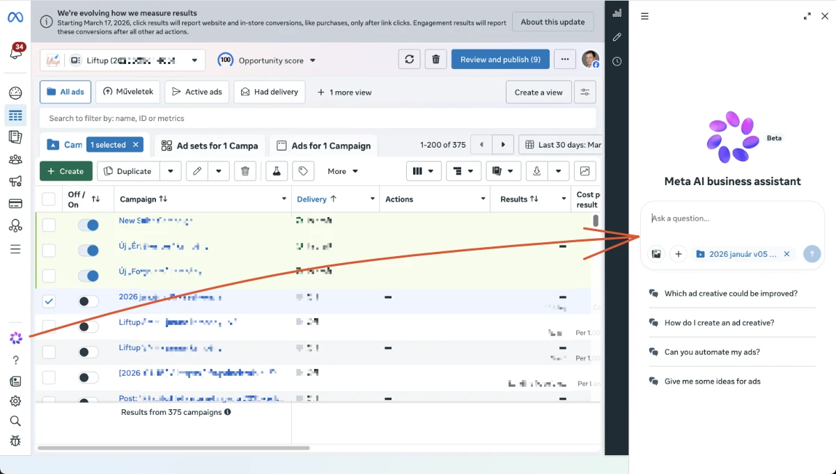 A Meta üzleti asszosztens azért jó, mert nem csak kampányadatokat néz, hanem segít a teljes hirdetési folyamatban: